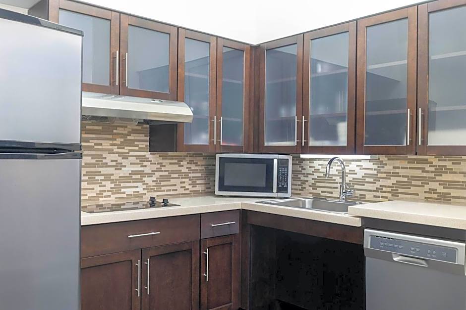 This suite features a seating area with a work desk, a cable TV and a kitchen with a microwave, a refrigerator and a stovetop. An private bathroom with a hairdryer is also included.